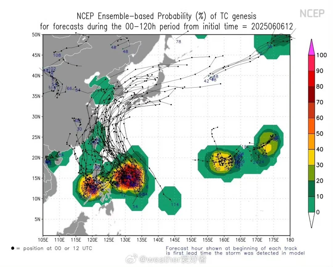 美國國家環境預報中心預測的從6月6日開始未來5天內的熱帶氣旋生成概率