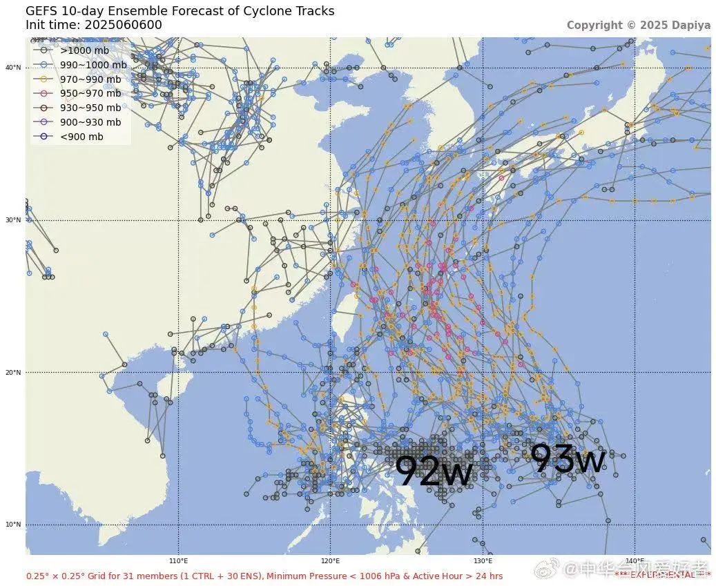 菲律賓以東熱帶擾動(92W)今天(7日)上午8點鐘位於菲律賓馬尼拉東南方向約620公里的海域(北緯14°,東經126°),中心附近最大風力5級(8米/秒)中心最低氣壓為1006百帕。