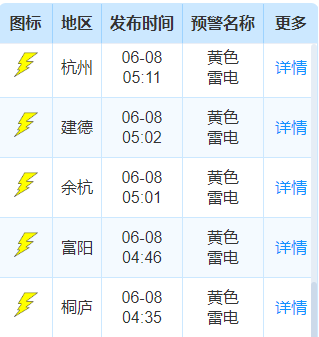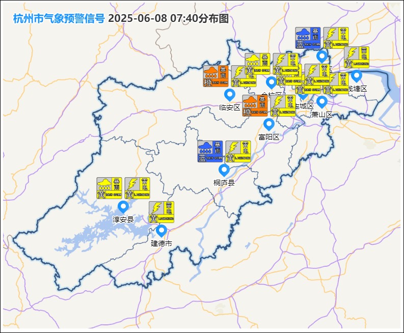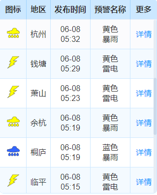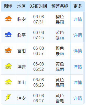 今日4點至7點30分,臨安、桐廬、富陽、餘杭、建德、杭州、臨平、蕭山、錢塘陸續發佈黃色預警。其中,富陽和臨安發佈暴雨橙色預警。