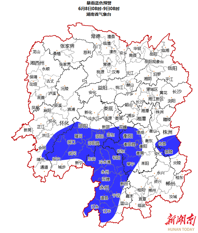 暴雨藍色預警顯示,預計6月8日8時至9日8時,株洲南部、衡陽、邵陽、永州、懷化東南部將出現暴雨,並伴有短時強降水、雷雨大風等強對流天氣。