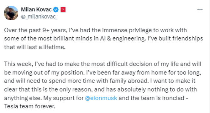 【環球網財經綜合報道】美東時間週五,特斯拉擎天柱人形機器人Optimus項目負責人米蘭·科瓦奇在X平台宣佈即將離職。他稱這是“一生中最艱難的決定”,原因是離家太久,需花更多時間陪伴國外家人,強調此決定“與其他任何事情都無關”,對馬斯克和特斯拉的支持“堅不可摧”。