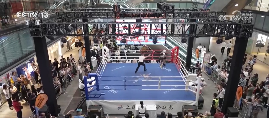 端午假期,在上海徐匯的一家商場裏,上海城市業餘聯賽-自由搏擊業餘公開賽火熱上演。標準的拳擊台、絢麗的燈光、高清的四方屏,持續吸引人羣入場觀賽。