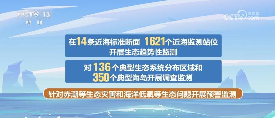 2024年,自然資源部組織實施海洋生態預警監測。在14條近海標準斷面、1621個近海監測站位開展生態趨勢性監測,對136個典型生態系統分佈區域和350個典型海島開展調查監測。針對赤潮等生態災害和海洋低氧等生態問題開展預警監測。
