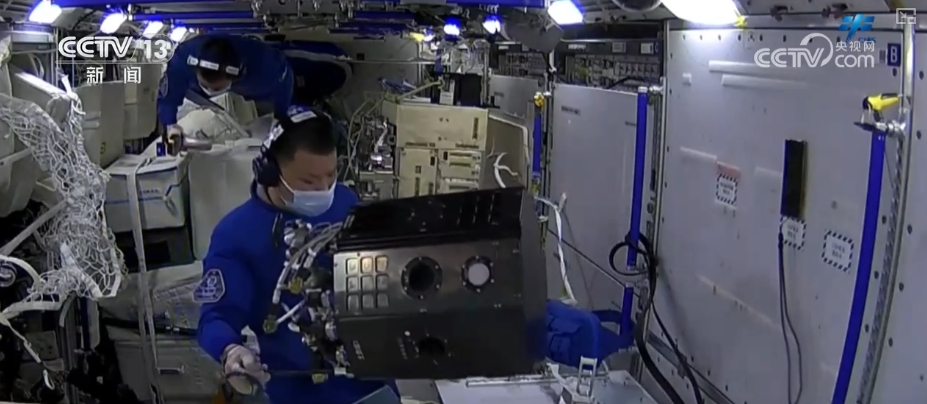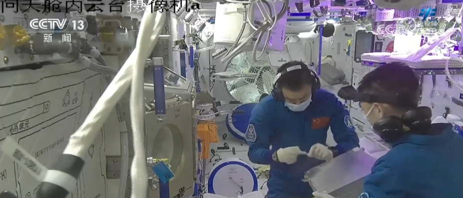 在微重力物理科學領域,乘組進行了燃燒科學實驗櫃實驗插件採樣蓋更換,無容器實驗櫃實驗腔體清理、樣品更換、軸心機構維護等工作,並開展了流體物理櫃“空間三相多液滴遷移行為研究”樣品液袋更換等工作,以探究微重力環境下的液滴熱毛細遷移運動。此外,乘組還完成了空間輻射生物學暴露裝置艙內自檢相關工作。