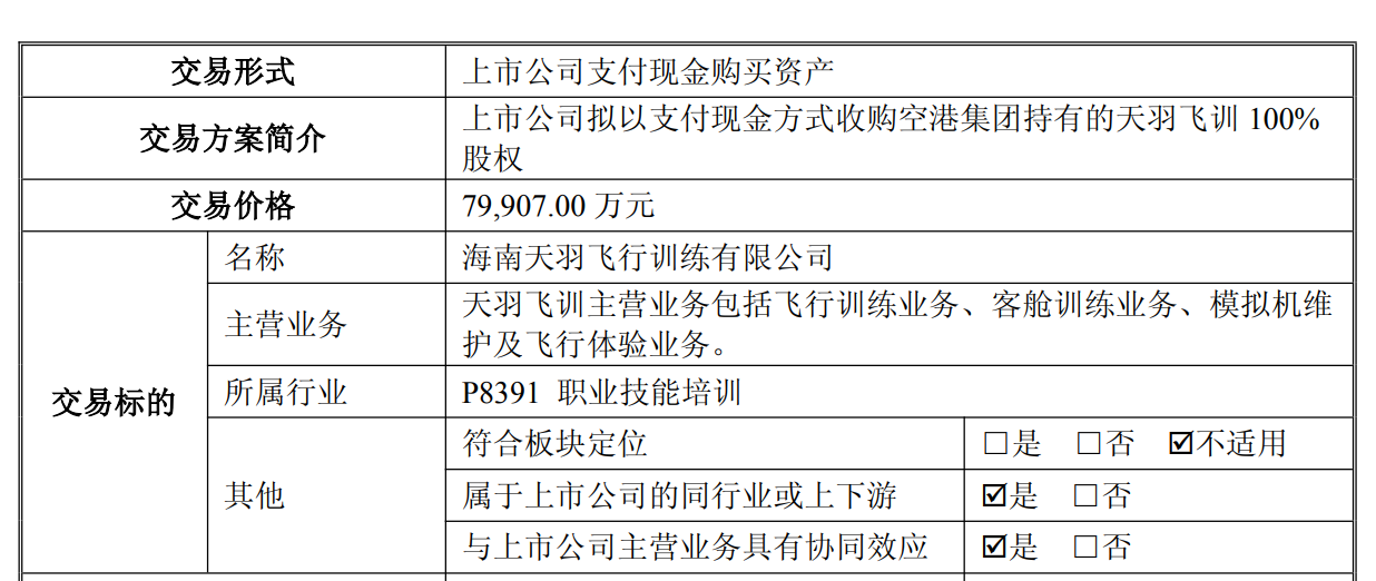 【環球網財經綜合報道】日前,海航控股發佈一系列公告,宣佈擬以7.99億元現金收購海南空港開發產業集團有限公司(以下簡稱“空港集團”)持有的海南天羽飛行訓練有限公司(以下簡稱“天羽飛訓”)100%股權。海航控股表示,此次交易不構成關聯交易,不構成重組上市。