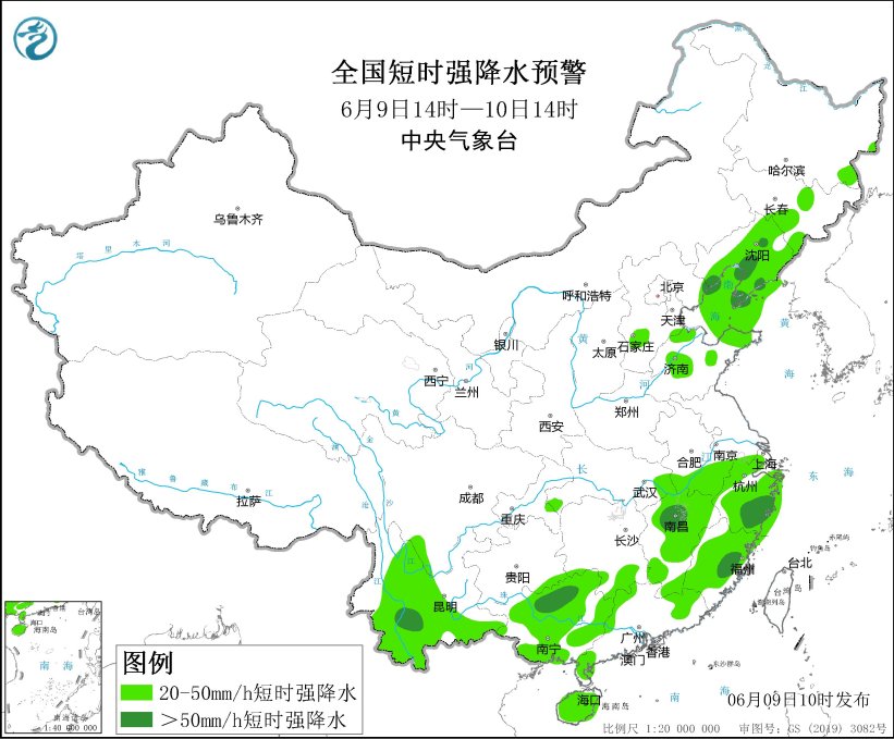 預計6月9日14時至10日14時,東北地區南部、華北中東部、黃淮北部等地的部分地區將有8級以上雷暴大風或冰雹天氣,其中,遼寧西部和南部、河北東南部和東北部、天津南部、山東中北部等地的部分地區將有10級以上雷暴大風,最大風力可達11級以上;東北地區南部、西南地區南部、江南中東部、華南西部和北部等地的部分地區將有小時雨量大於20毫米的短時強降水天氣,其中,遼寧西部和南部、江西北部、浙江南部、福建東部、雲南西南部、廣西北部等地的部分地區小時雨量大於50毫米,最大可達70毫米以上。