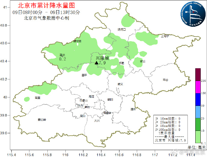 目前降水主要集中在北部西部地區,山區相對明顯。截至今天13時30分,最大降水量在懷柔興隆城,7.9毫米。