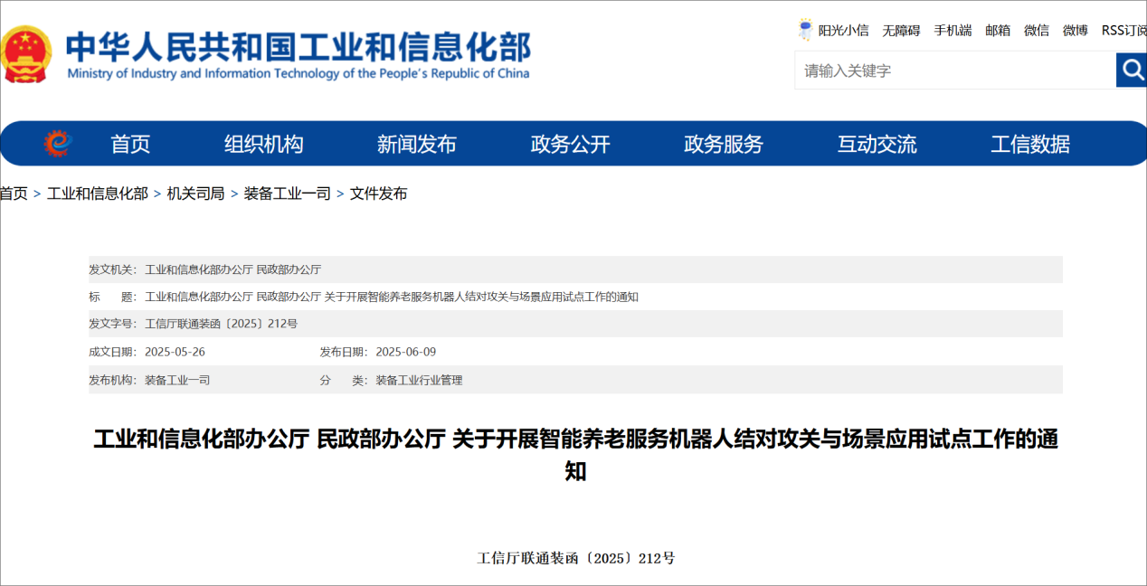 總體要求上,通知提到,堅持“政府引導、需求牽引、分步實施、持續迭代”的原則,重點聚焦提升老年人生活質量、緩解家庭養老照護壓力、彌補機構和社區養老服務人力缺口、促進完善養老服務體系,分階段實施一批智能養老服務機器人攻關和應用試點項目,促進研用雙方結對開展攻關,推動產品在家庭、社區和養老機構等場景中應用驗證和迭代升級,形成一批能夠滿足多層次、多樣化養老服務需求的機器人產品,持續建立和完善標準規範及評價體系,加快推動機器人賦能智慧養老服務和銀髮經濟發展。