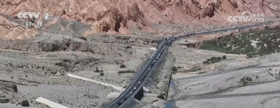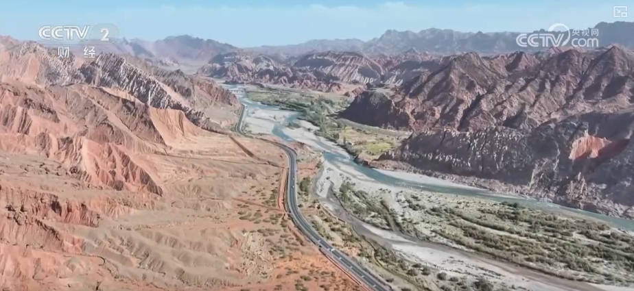 獨庫公路南段主要在新疆庫車境內,這裏景色與北段相比獨有特色。在紅山石林景觀台上遠遠望去,赤紅的巖壁在陽光下泛着耀眼的光芒,與附近不同色彩的山體交相輝映。