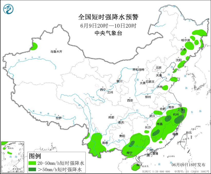 預計6月9日20時至10日20時,東北地區東部、黃淮東部、江南東部、華南北部等地的部分地區將有8級以上雷暴大風或冰雹天氣,其中,遼寧南部、山東東部等地的部分地區將有10級以上雷暴大風,最大風力可達11級以上;東北地區東部、黃淮東部、西南地區南部、江南中東部、華南西部和北部等地的部分地區將有小時雨量大於20毫米的短時強降水天氣,其中,江西東北部和西南部、浙江東部和南部、廣西中部等地的部分地區小時雨量大於50毫米,最大可達70毫米以上。