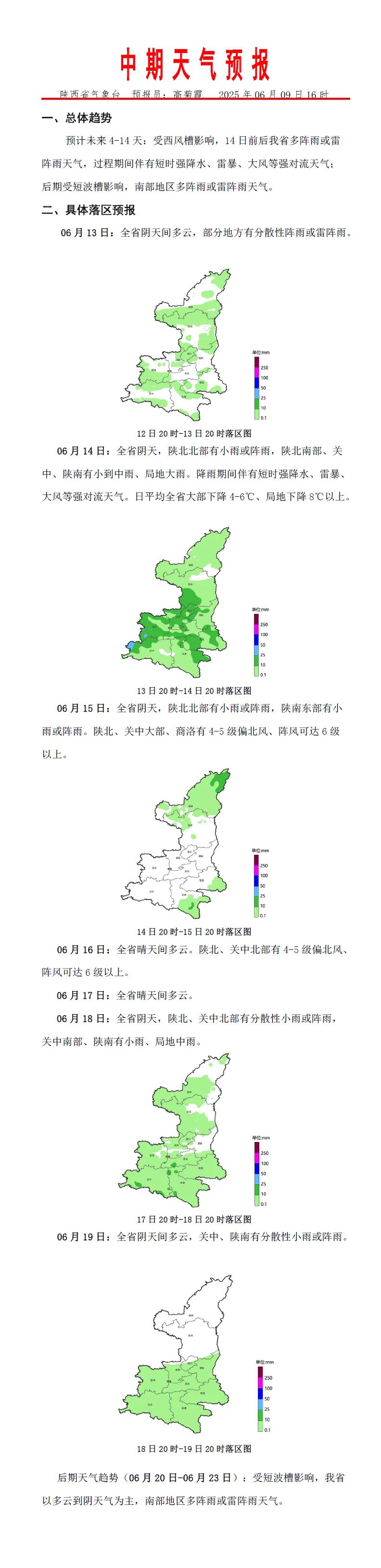 據最新預報,陝西接下來依然有降雨:預計未來4-14天,受西風槽影響,14日前後陝西省多陣雨或雷陣雨天氣,過程期間伴有短時強降水、雷暴、大風等強對流天氣;後期受短波槽影響,南部地區多陣雨或雷陣雨天氣。