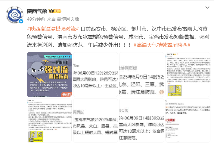 另據陝西氣象,目前西安市、楊凌區、銅川市、漢中市都已發佈雷雨大風黃色預警信號,渭南市發佈冰雹橙色預警信號,咸陽市、寶雞市發佈短臨警報。