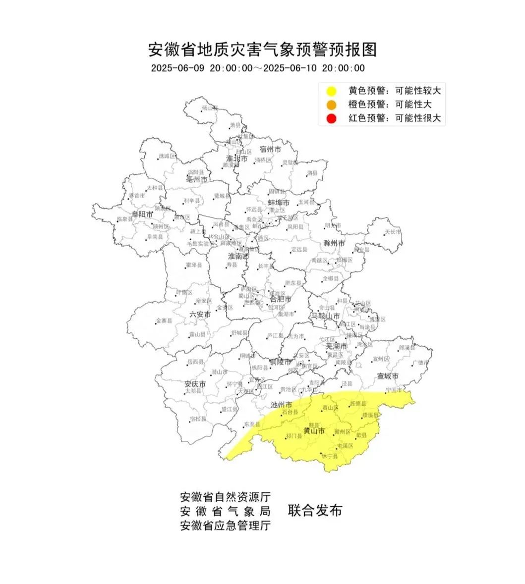 2025年6月9日20時—6月10日20時,地質災害黃色預警:黃山市全境,池州市全境,宣城市寧國市、績溪縣、旌德縣、涇縣發生地質災害的可能性較大,請注意防範,並加強隱患巡查和排查,一旦發現隱患,提前避險轉移。