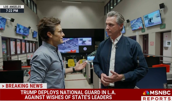 “我們談了將近20分鐘。”紐森在接受美國微軟-全國廣播公司(MSNBC)採訪時説,“我試圖討論洛杉磯(的情況),但他想談的都是其他話題。我們的對話十分體面。”“他一次都沒有提過國民警衞隊。”紐森補充説,“他説他提過。……從來沒有。”