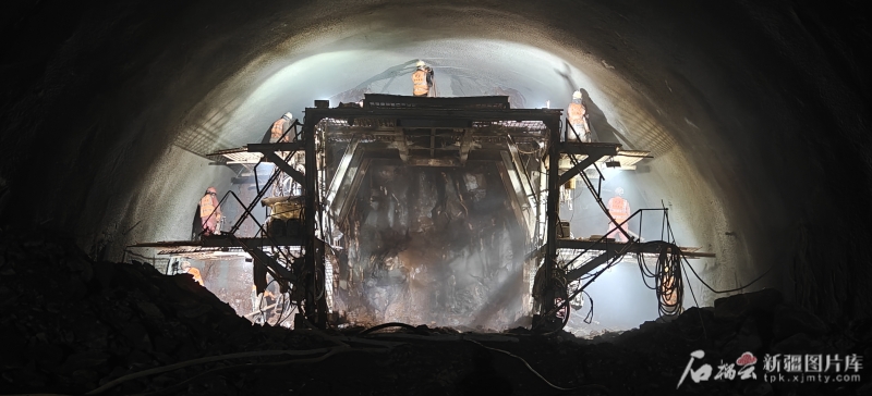 國道218線那拉提至巴侖台公路項目艾肯隧道內,挖掘機長臂揮舞、裝載機來回穿梭,建設者身着反光背心、頭戴安全帽,在各自崗位上緊張有序地忙碌着。