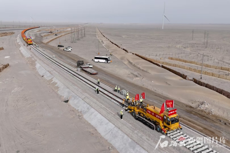 羅布泊至若羌鐵路(以下簡稱“羅若鐵路”)米蘭至羅布泊段鋪軌現場,鋪軌機把一段500米長的鋼軌平穩落入鋼軌槽中,新疆環線的最後一條鐵路——羅若鐵路鋪軌工程穩步推進。