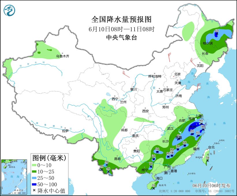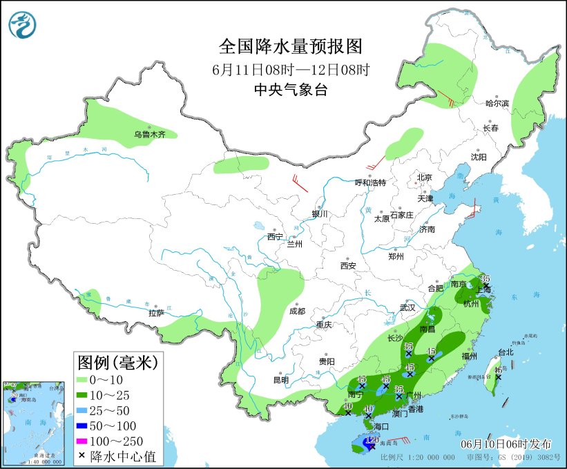 *6月10日08時至11日08時,*黑龍江中東部、吉林北部、雲南西南部、江南中東部和西南部、華南中西部等地部分地區有中到大雨,其中,黑龍江中部、安徽南部、浙江、江西中南部、廣東北部、廣西中東部等地局地有暴雨(50~90毫米)。內蒙古中西部、遼寧、山東半島等地部分地區有4~5級風(見圖1)。南海南部海域將有5~7級風,陣風8級。