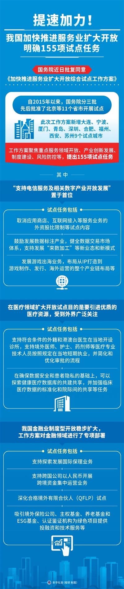 據瞭解,《方案》從重點服務領域開放、產業創新發展等多個維度,明確了一共155項試點任務。同時提出加快試點實施節奏、加大壓力測試和複製推廣力度。