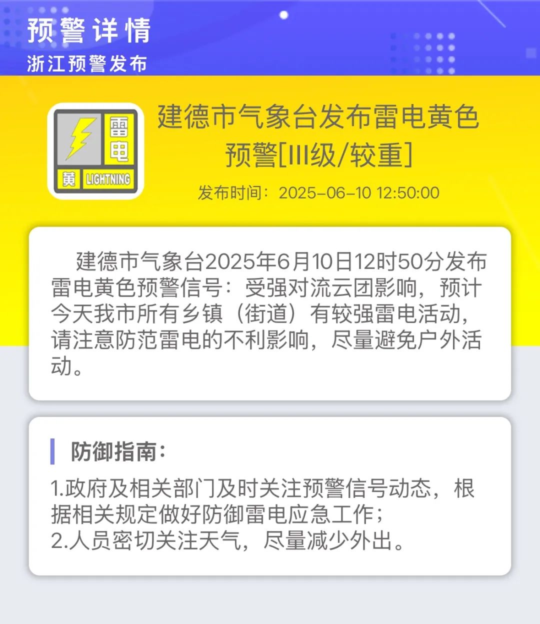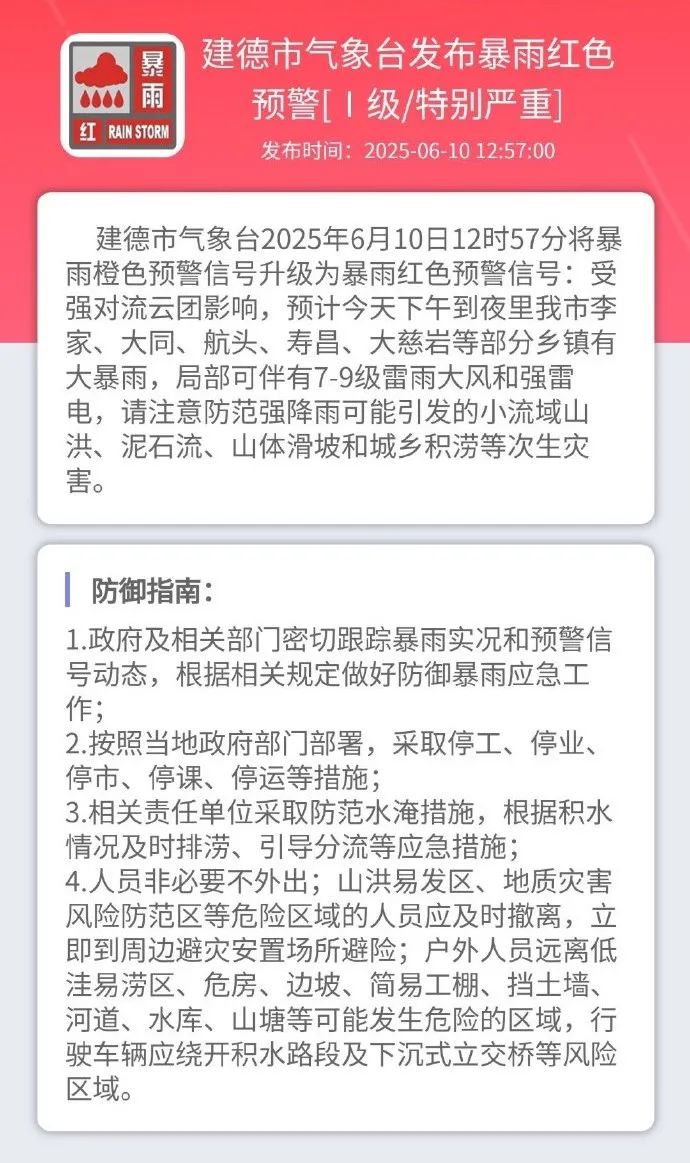 6月10日8時27分,浙江省自然資源廳、浙江省氣象局聯合更新發布地質災害氣象風險預警,其中建德地質災害氣象風險較高: