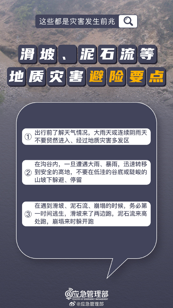 06月10日08時至06月11日08時,衢州市(開化縣)等部分地區地質災害氣象風險高(橙色預警);杭州市(西湖區、濱江區、餘杭區、臨安區、淳安縣、建德市)、寧波市(寧海縣)、温州市(平陽縣、蒼南縣、文成縣、泰順縣、瑞安市、樂清市、龍港市)、湖州市(吳興區、長興縣、安吉縣)、衢州市(衢江區)、麗水市(蓮都區、青田縣)等部分地區地質災害氣象風險較高(黃色預警)。請密切關注雨量情況,做好地質災害防範工作!