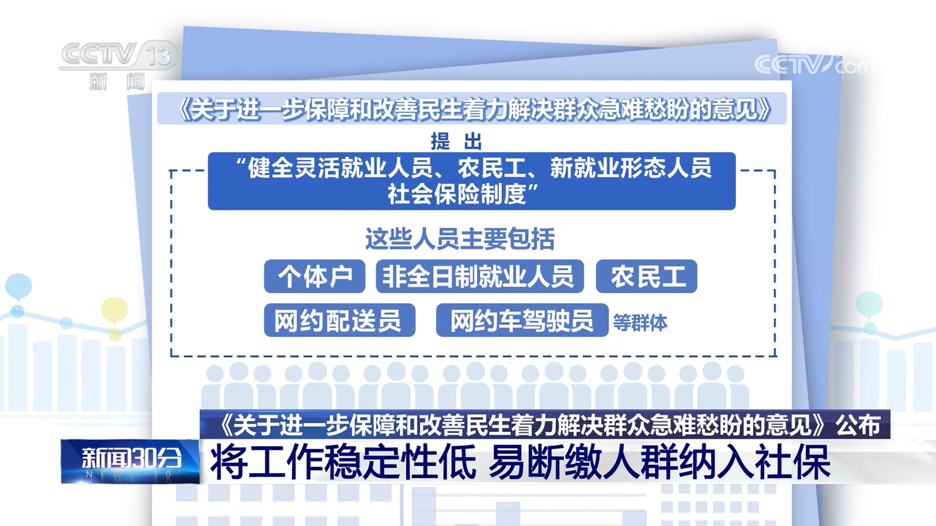 《意見》提出要“健全靈活就業人員、農民工、新就業形態人員社會保險制度”。專家告訴記者,這些人員主要包括:個體户、非全日制就業人員、農民工、網約配送員、網約車駕駛員等羣體。《意見》明確將這部分工作穩定性低、容易出現斷繳社保的人羣,納入了社會保障覆蓋範圍。
