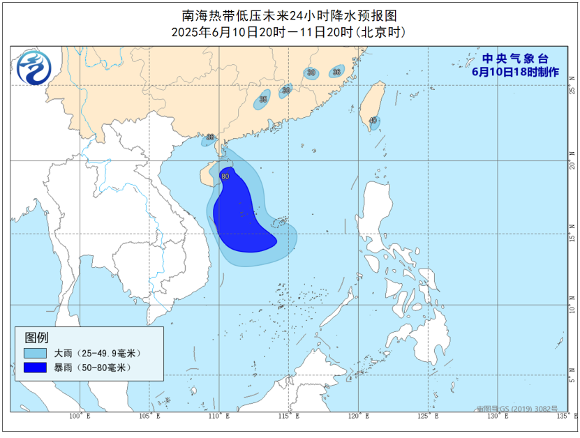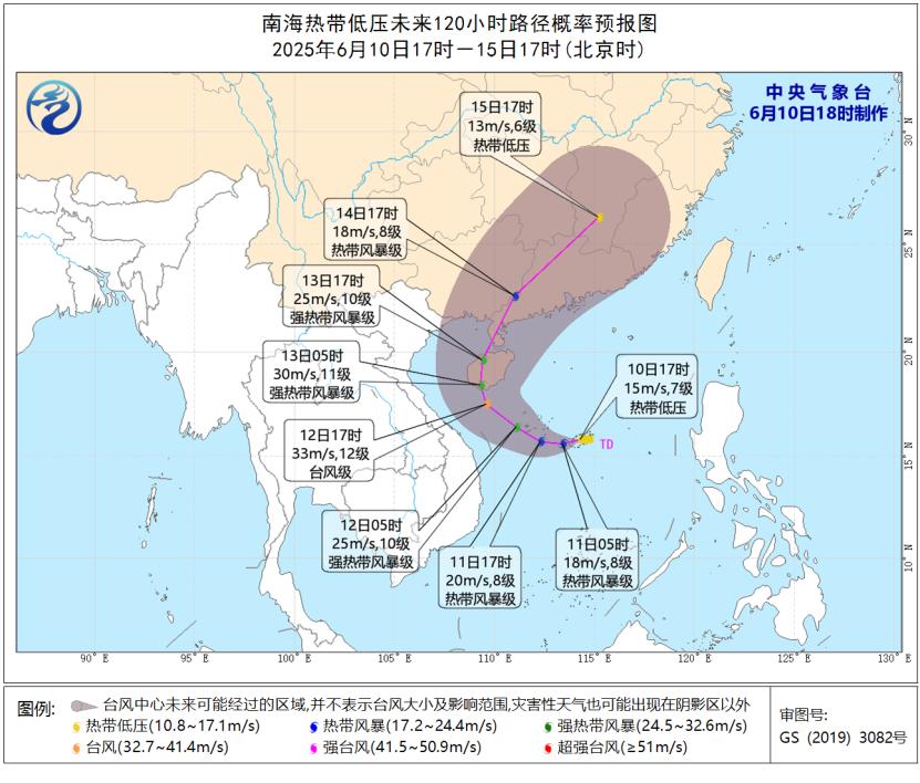 中央氣象台6月10日18時繼續發佈熱帶低壓預報*:*