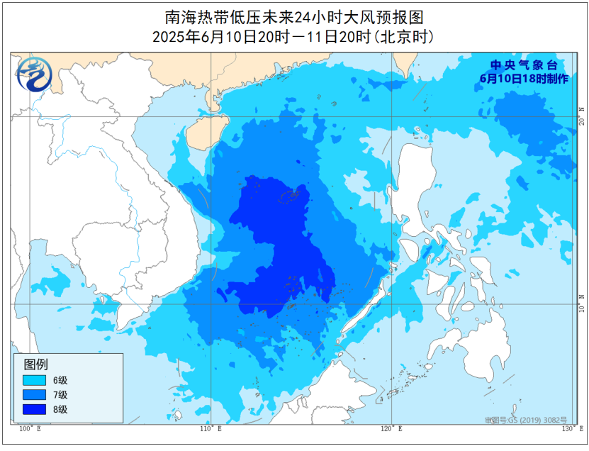 大風預報: 6月10日20時至11日20時,巴士海峽、南海大部、瓊州海峽、廣東沿海、海南島東部沿海將有6-7級大風,南海中部和南部的部分海域、西沙羣島、南沙羣島和中沙羣島附近海域的風力將有8級,陣風可達9-10級。