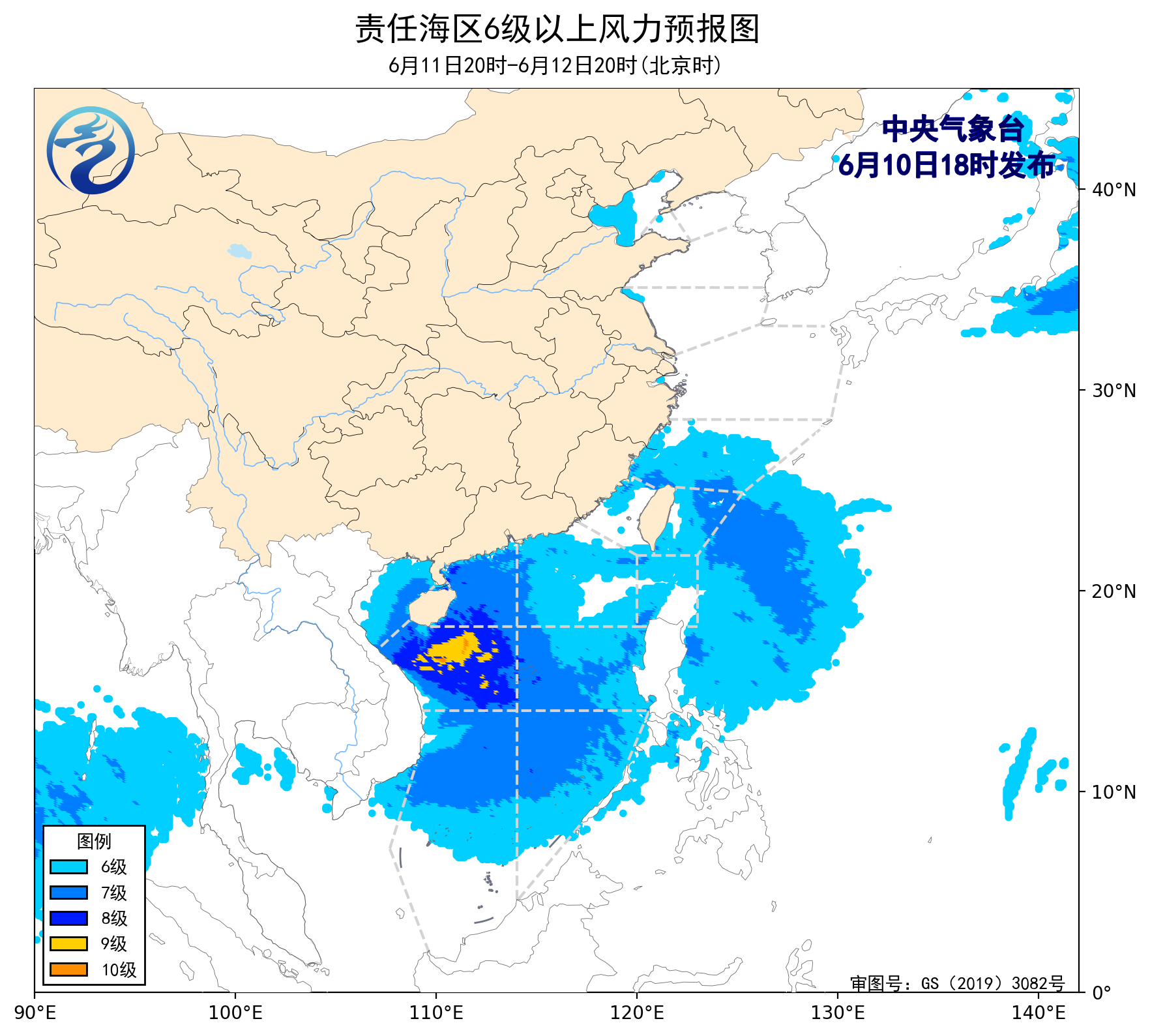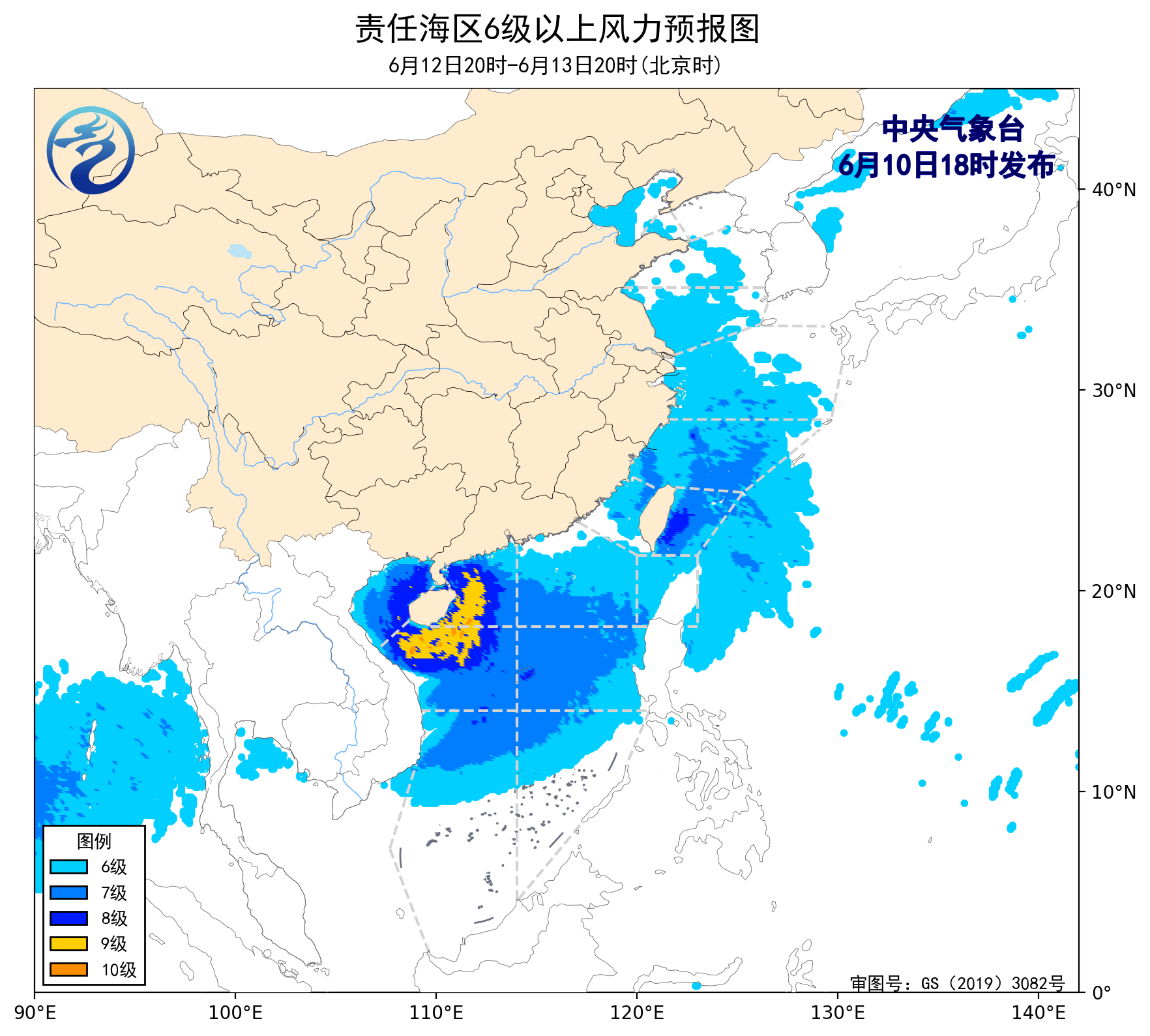 6月10日02時至14時,南海大部海域出現了5~6級、陣風7級的偏東風,南海中西部海域出現了6~7級、陣風8級的旋轉風。黃海北部的部分海域出現了能見度不足1公里的大霧。