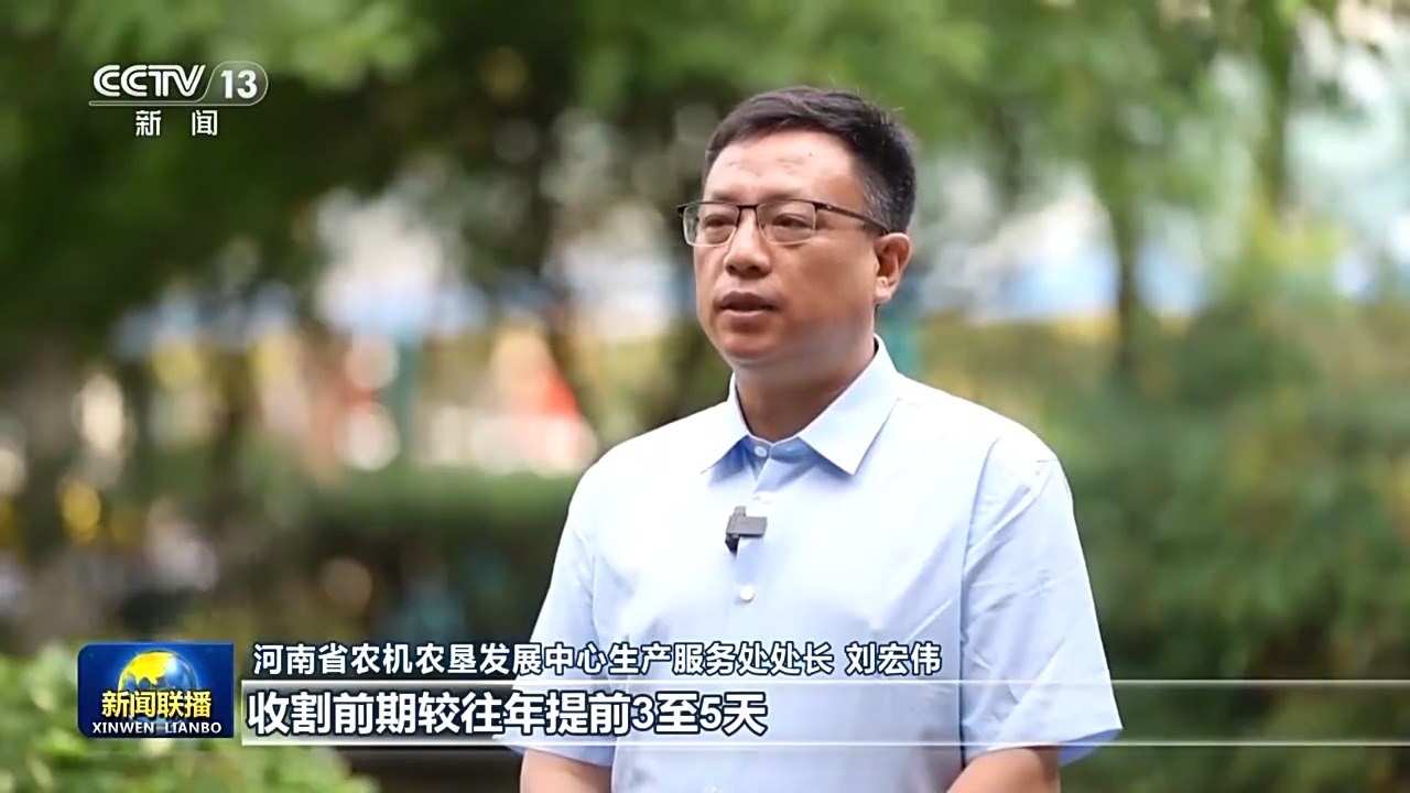 *河南省農機農墾發展中心生產服務處處長 劉宏偉:*收割前期較往年提前3至5天,每秒10公斤喂入量的收割機成為主力機型,全省有12天日收穫小麥超過300萬畝,最高日收穫小麥715萬畝。