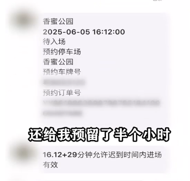 6月5日下午,深圳新聞網記者就爆料內容進行核實。記者發現,“閒魚”app上有眾多公園停車位預約店鋪。當天15點,記者從“深i公園”微信小程序預約福田區香蜜公園停車位,被提示“已約滿,請稍後再嘗試預約”;但在“閒魚”app上,記者花費14.99元就成功預約該公園16點12分的停車位,允許遲到29分鐘進場。