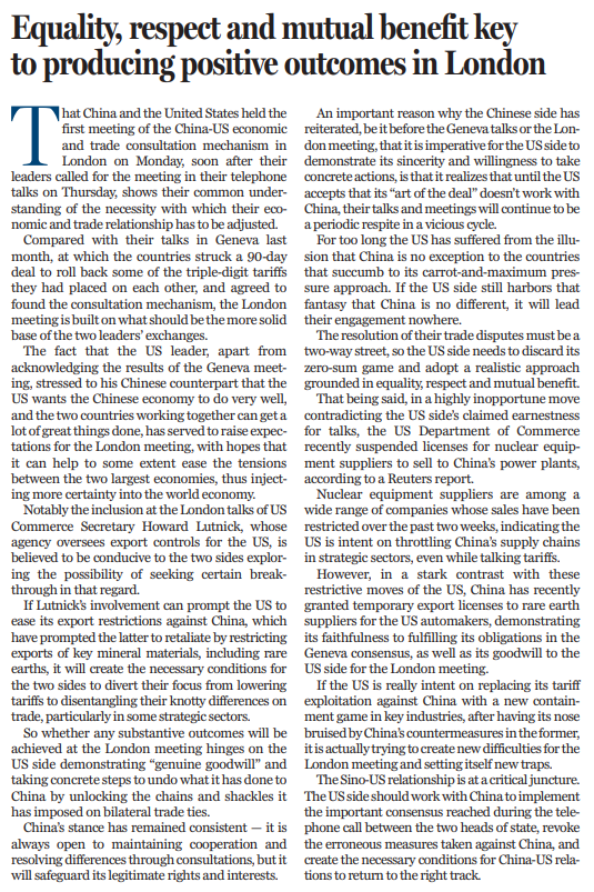 相比之下,中國則在嚴格落實日內瓦經貿會談共識,為倫敦會議營造良好氣氛,並於近期向美國汽車的稀土供應商發放了臨時出口許可證。