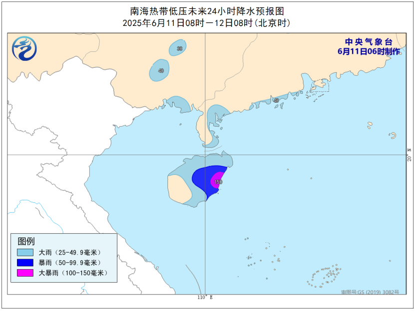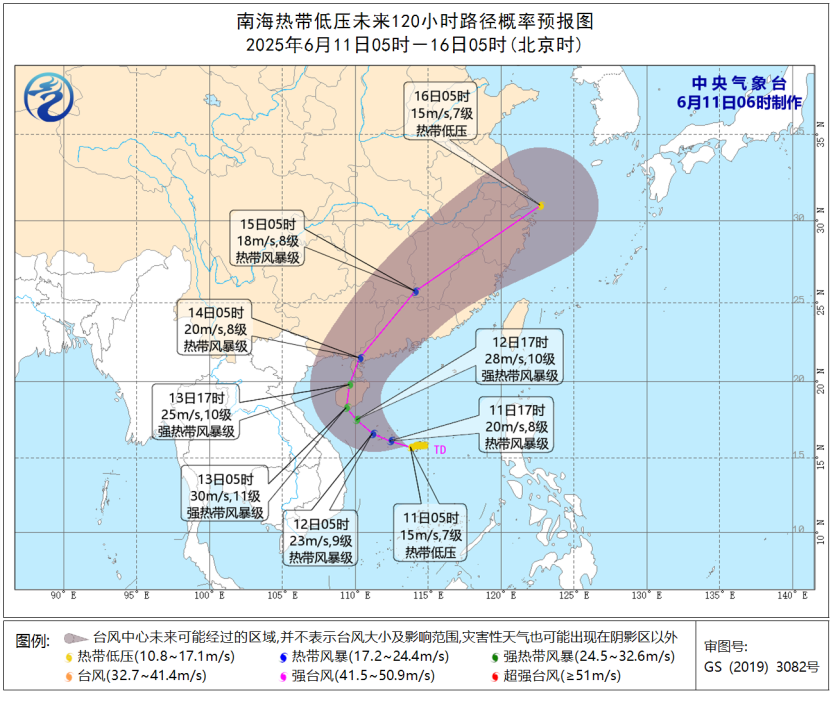 中央氣象台6月11日06時繼續發佈熱帶低壓預報*:*