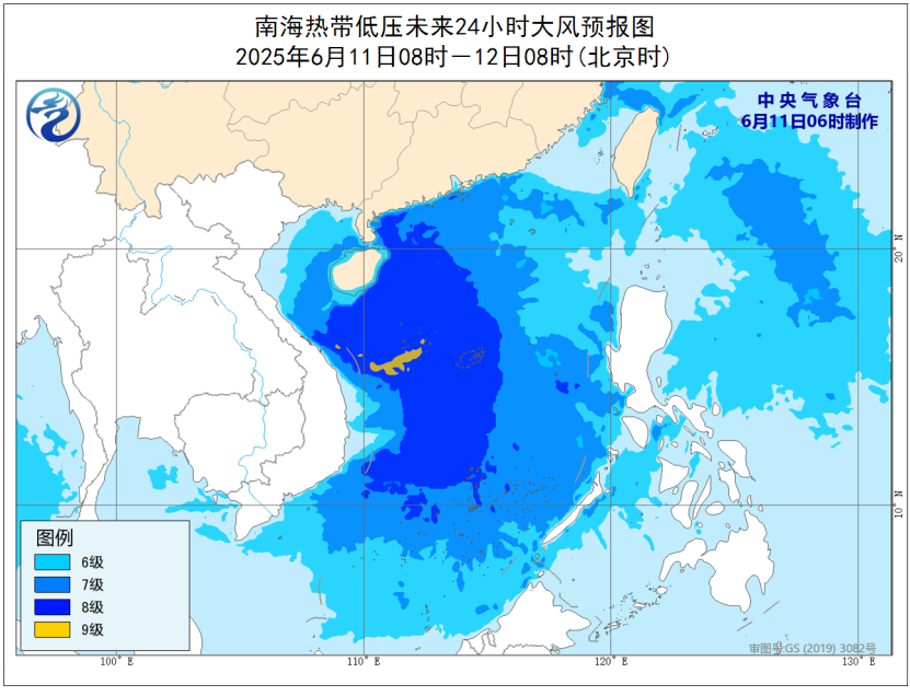 *大風預報:*6月11日08時至12日08時,巴士海峽、南海大部、北部灣、瓊州海峽、南沙羣島、中沙羣島、廣東沿海、海南島沿海將有6-8級大風,南海中西部、西沙羣島附近海域的風力將有9級,陣風可達10-11級。