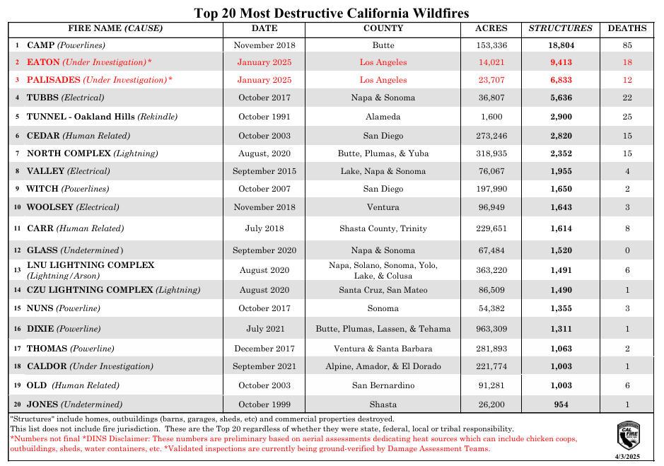 根據美國加州林業和消防局的統計,本次在洛杉磯發生的山火中的兩起——伊頓山火和帕利塞德山火,分別列入加州歷史上最嚴重的20起山火中的第二位與第三位。截至4月3日,死於這兩起嚴重山火的遇難者人數已升至30人。