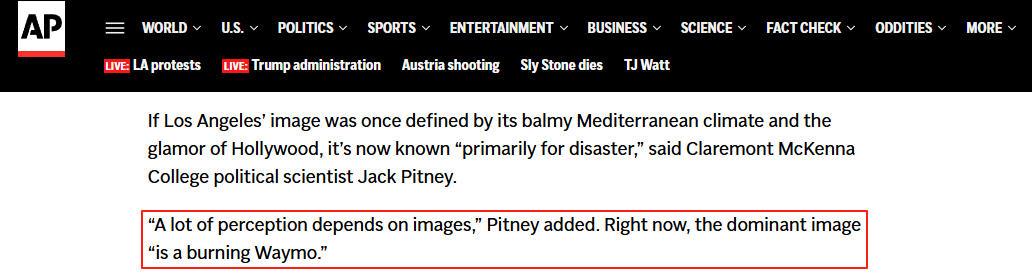 “很多感知都取決於圖像,但目前有關洛杉磯市的主流印象,都是一張張燃燒的無人駕駛出租車的圖片。”