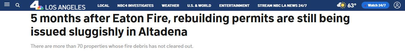 △美國全國廣播公司:伊頓山火爆發5個月後,阿爾塔迪納的重建許可證發放仍然緩慢