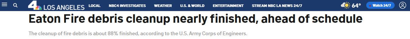 截至5月30日,僅洛杉磯伊頓山火中受災程度最重的阿爾塔迪納地區,其山火廢墟清理工作僅完成約88%。即便如此,當地媒體在對廢墟清理工作的報道中仍然使用了“接近提前完成”的表述。因為此前的清理計劃是到2026年1月前完成。