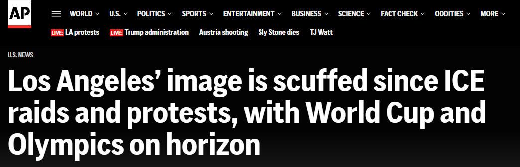 △美聯社6月10日發表題為《自騷亂髮生以來,洛杉磯的形象大打折扣,然而世界盃與奧運會即將到來》的文章。