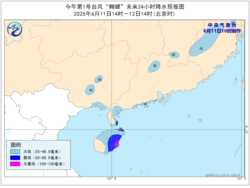 *大風預報:*6月11日14時至12日14時,南海大部、北部灣、瓊州海峽、西沙羣島、南沙羣島、中沙羣島、廣東沿海、海南島沿海將有6-8級風,陣風9-10級,颱風中心經過的附近海域風力可達9-10級,陣風11-12級。