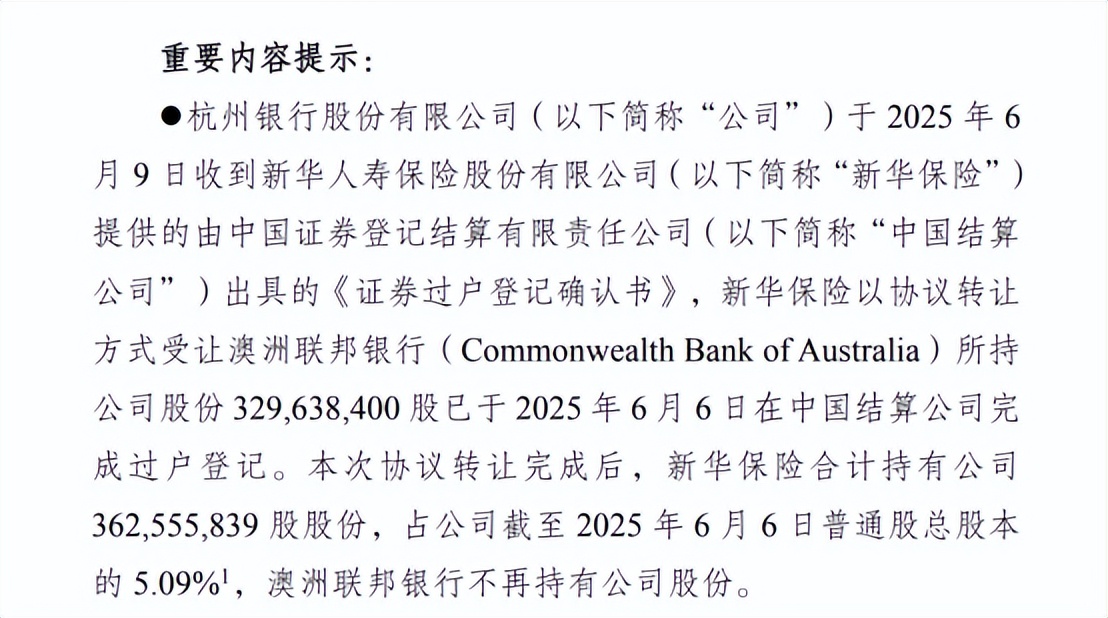 【環球網財經綜合報道】6月10日,杭州銀行發佈公告稱,新華人壽保險股份有限公司(以下簡稱“新華保險”)以協議轉讓方式受讓澳洲聯邦銀行持有的該行近3.3億股股份,轉讓完成後,澳洲聯邦銀行不再持有杭州銀行股份。