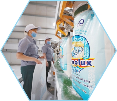 在中國西安愛菊集團哈薩克斯坦園區,工作人員在麪粉生產線上作業。