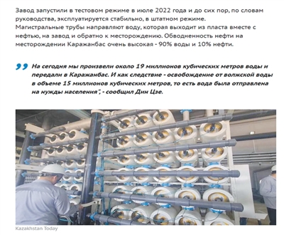 ——摘自今日哈薩克斯坦通訊社報道《為卡拉贊巴斯油田淡化處理逾1900萬立方米地層水》