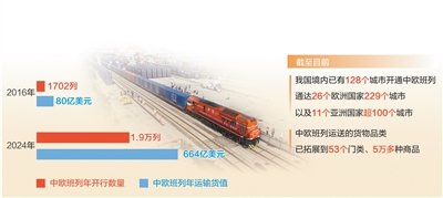 目前,中歐班列去、回程開行基本均衡,綜合重箱率基本穩定在100%。中歐班列年運輸貨值由2016年的80億美元增長到2024年的664億美元,累計貨值超4500億美元。