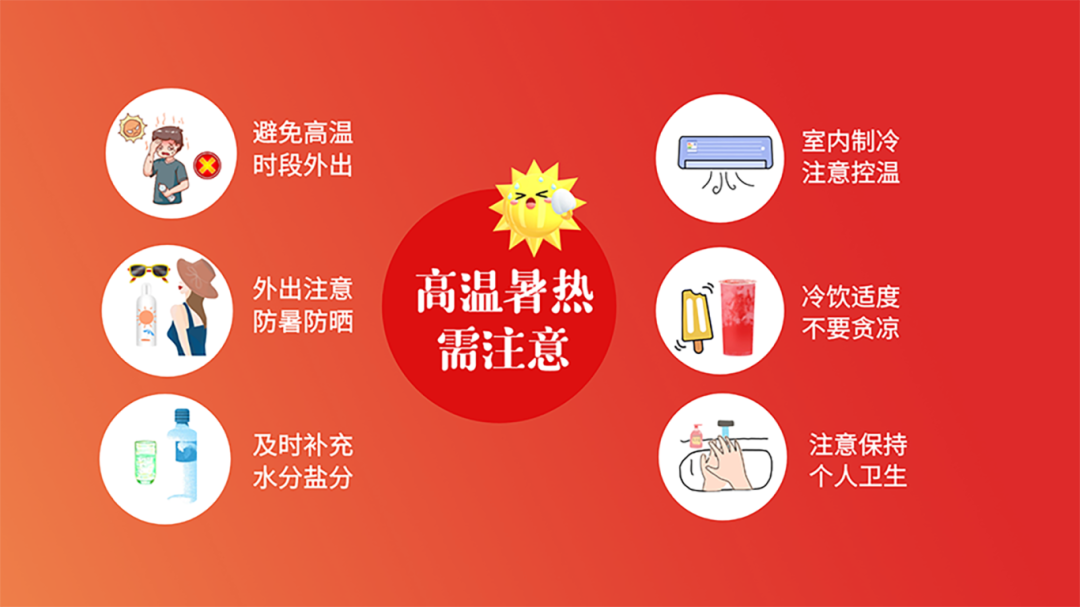 高温來勢洶洶,提醒公眾一定要做好防暑降温工作,尤其是中午前後,儘量避免高強度的户外活動,謹防中暑和熱射病的發生。