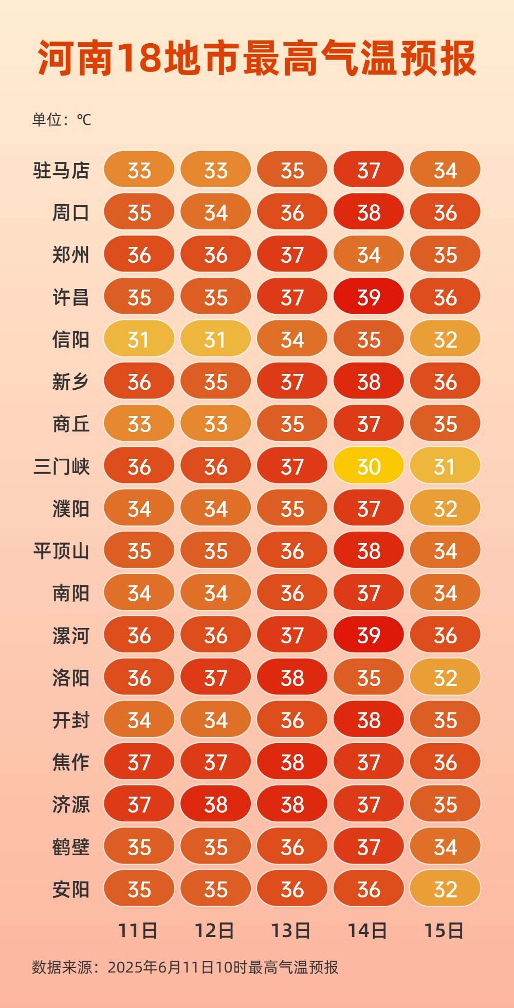 本輪高温範圍廣、持續時間長,不少地區*(許昌、漯河、焦作、濟源等地)未來一週幾乎是高温全勤!尤其是焦作、濟源37℃以上高温持續長達4天*!