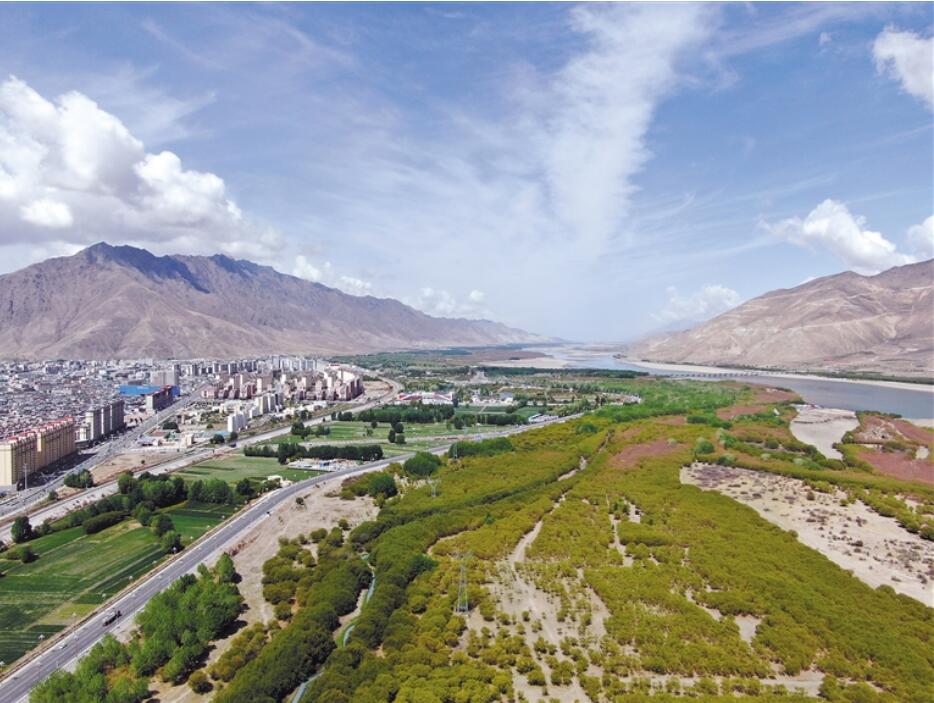 雅江中游“百里綠色生態長廊”與日新月異的山南市區和諧共生,展現出高原獨有的生態之美(無人機照片)。記者 武沛濤 攝
