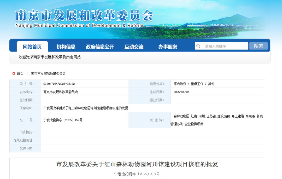 日前,南京市發展改革委發佈《關於紅山森林動物園河川館建設項目核准的批覆》,同意實施紅山森林動物園河川館建設項目。