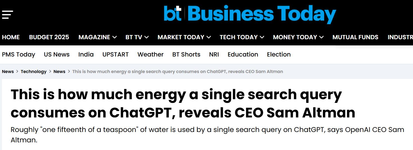 【環球網科技綜合報道】6月11日消息,據businesstoday報道,OpenAI 首席執行官 Sam Altman 近日披露了 ChatGPT 單次搜索查詢的能耗信息。他表示,一次查詢大約消耗 0.34 瓦時的電力以及 0.000085 加侖的水,相當於 “十五分之一茶匙” 的水量。