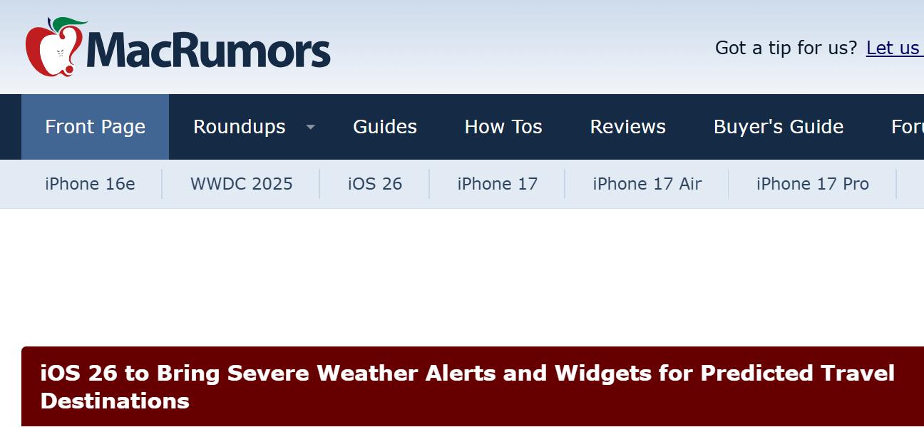 【環球網科技綜合報道】6月11日消息,據外媒macrumors報道稱,蘋果公司宣佈在 iOS 26 中將為天氣應用引入新的功能,包括惡劣天氣警報和預測旅行目的地的小部件。這一升級將為用户提供各種主動通知,幫助他們提前瞭解目的地的天氣情況。