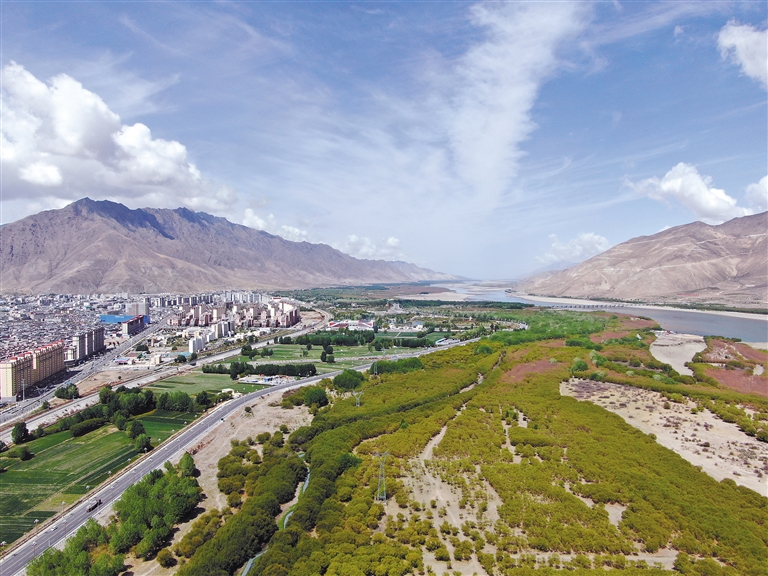 雅江中游“百里綠色生態長廊”與日新月異的山南市區和諧共生,展現出高原獨有的生態之美(無人機照片)。記者 武沛濤 攝